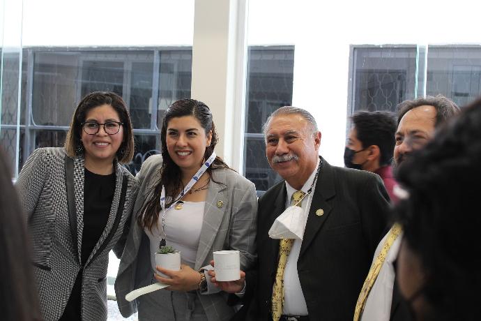Alumnos de servicio social de laboratorio dieron a los invitados un regalo conmemorativo que incluía una maceta y una medalla.